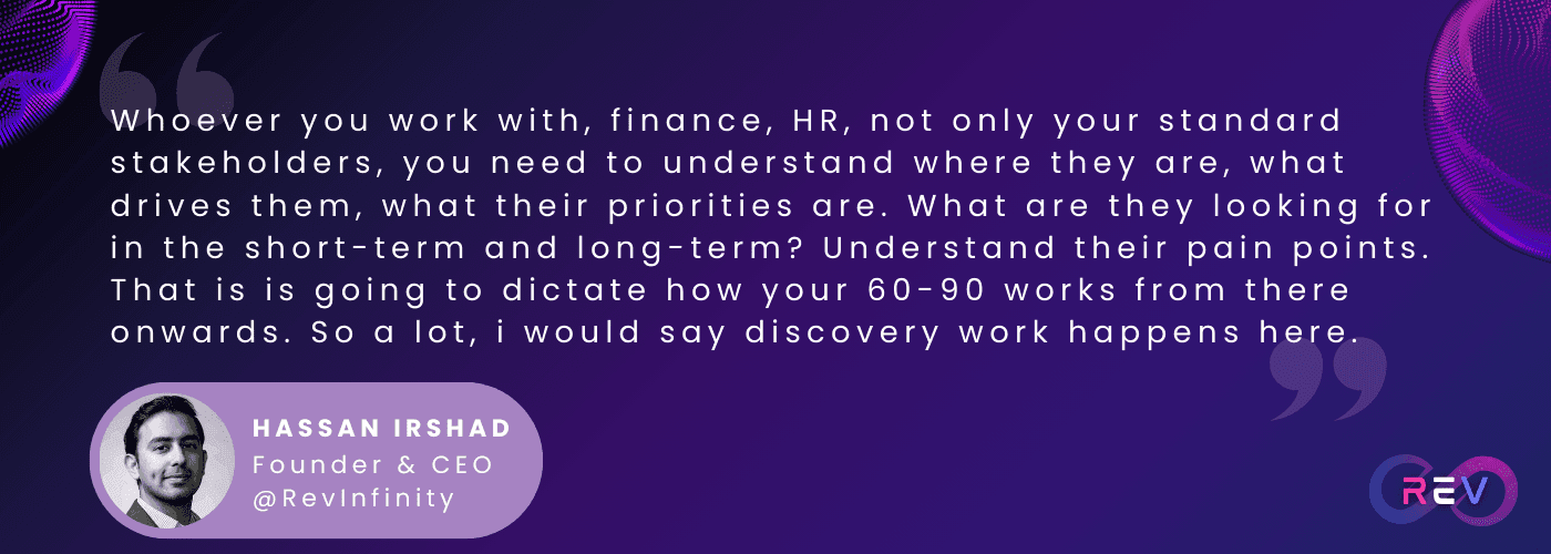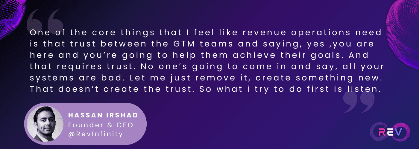Establish trust within your teams by listening carefully, asking questions about how RevOps can help, and addressing quick fixes to show you’re there to help. Having this trust shows them that you’re here to support their success. Quick wins, such as small fixes that make people’s jobs easier, helps in establishing credibility early.