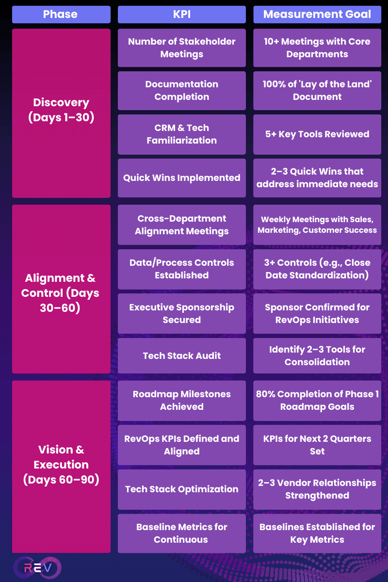As you approach the end of the first 30 days, start establishing RevOps-specific KPIs that match company goals, which may involve metrics like revenue increase, conversion rates, or improvements in overall efficiency.
